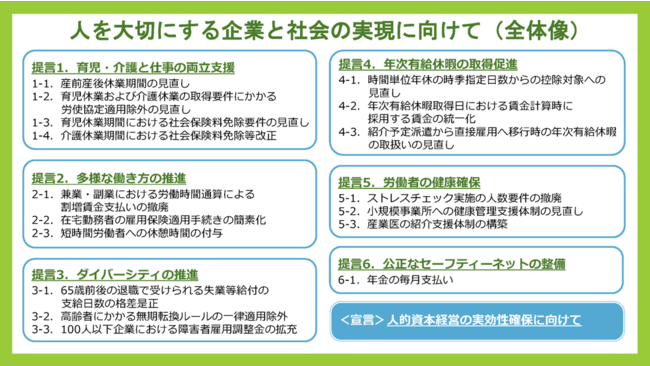 本提言の取りまとめにあたっては、全国の社労士から広く意見募集を行い、とりわけ柔軟な働き方の推進を中心とする働き方改革の流れを阻害している法制度や、現場で不公平・非効率な運用を生んでいる法規制など、現行法制度において改善すべきと思われる点として17項目の提言を取りまとめた。また、「働く」ことの価値観や働き方などが多様化するなか、社労士は人的資本経営の専門家であることを宣言している。
