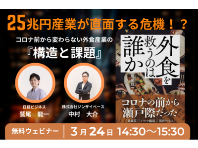 株式会社ジンザイベース(本社:東京都千代田区、代表取締役:中村大介)は、鷲尾龍一氏(日経ビジネス記者)と合同で『25兆円産業が直面する危機!? - コロナ前から変わらない外食産業の「構造と課題」』をテーマにオンラインセミナーを3月24日(金)に開催いたします。