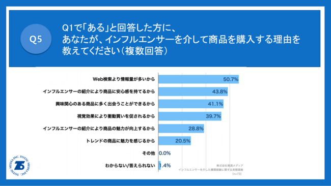 Q1で「ある」と回答した方に、「Q5.あなたが、インフルエンサーを介して商品を購入する理由を教えてください。(複数回答)」(n=73)と質問したところ、「Web検索より情報量が多いから」が50.7%、「インフルエンサーの紹介により商品に安心感を持てるから」が43.8%、「興味関心のある商品に多く出会うことができるから」が41.1%という回答となりました。