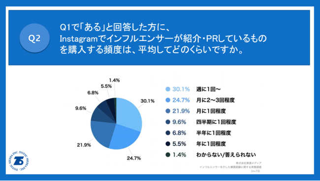 Q1で「ある」と回答した方に、「Q2.Instagramでインフルエンサーが紹介・PRしているものを購入する頻度は、平均してどのくらいですか。」(n=73)と質問したところ、「週に1回~」が30.1%、「月に2~3回程度」が24.7%という回答となりました。