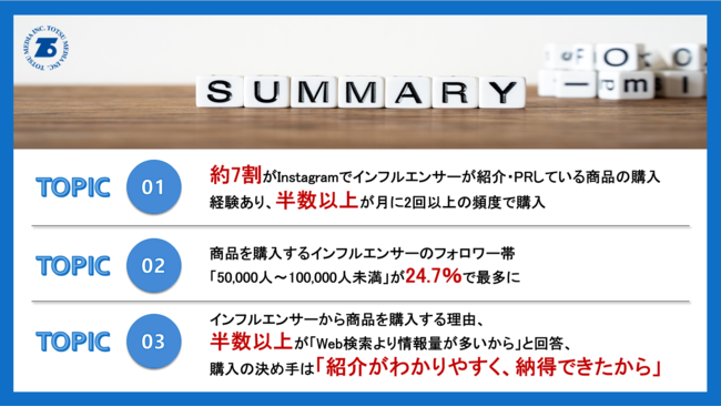 今回の調査では、インフルエンサーがフォロワーに対して絶大な信頼を得ており、購買行動にも大きな影響を与えていることが分かりました。企業が商品やサービスをPRする上でも、インフルエンサーを巻き込み、商品やサービスの安心感を高めることで売り上げアップが見込めると言えるでしょう。