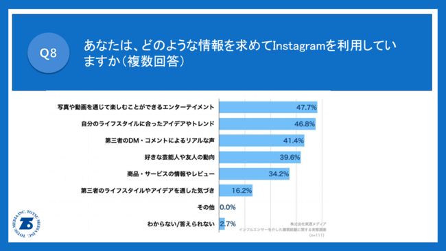 「Q8.あなたは、どのような情報を求めてInstagramを利用していますか。(複数回答)」(n=111)と質問したところ、「写真や動画を通じて楽しむことができるエンターテイメント」が47.7%、「自分のライフスタイルに合ったアイデアやトレンド」が46.8%、「第三者のDM・コメントによるリアルな声」が41.4%という回答となりました。