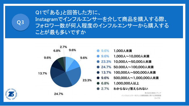 Q1で「ある」と回答した方に、「Q3.Instagramでインフルエンサーを介して商品を購入する際、フォロワー数が何人程度のインフルエンサーから購入することが最も多いですか。」(n=73)と質問したところ、「50.000人~100,000人未満」が24.7%、「10,000人~50,000人未満」が23.3%という回答となりました。