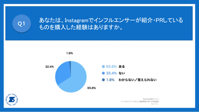 株式会社東通メディア(本社:東京都中央区、代表取締役社長:赤池文孝)は、Instagramを1日1時間~利用している、20代~50代111名を対象に、インフルエンサーを介した購買経験に関する実態調査を実施いたしましたので、お知らせいたします。