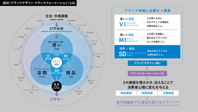 私たちが提唱するBDX (ブランドデザイン・トランスフォーメーション)は、ブランドデザインという手法によって、様々な社会変化が起こる消費者環境を鑑みながら、ブランドや企業の価値を時代に合わせて変容させ、顧客価値として増大させる事を指します。