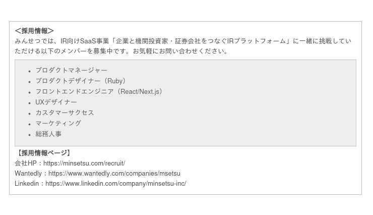 国内外へのサービスの加速的な普及に伴い、今後より一層、ユーザーの皆様に安心してサービスをご利用いただくために、ISO 27001 に則った情報セキュリティ管理体制の構築と運用を進めてまいりました。今回のISMS認証取得により、今後も継続的な改善に取り組むとともに、みんせつが提供するIRコミュニケーションプラットフォームの国内外での普及による上場会社と投資家間の対話の促進に努めてまいります。