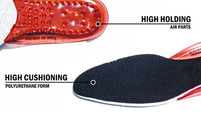 インソールには、人間工学に基づいた〈RESILIENCE AIR SOLE(レジリエンスエアソール)〉を採用。歩行時にエアーパーツが衝撃を吸収し、アーチを支え、かかとから土踏まずにかけてしっかりホールド。膝や腰への負担を軽減する設計になっています。また、素材にポリウレタンフォームを使うことで優れたクッション性も兼備させました。