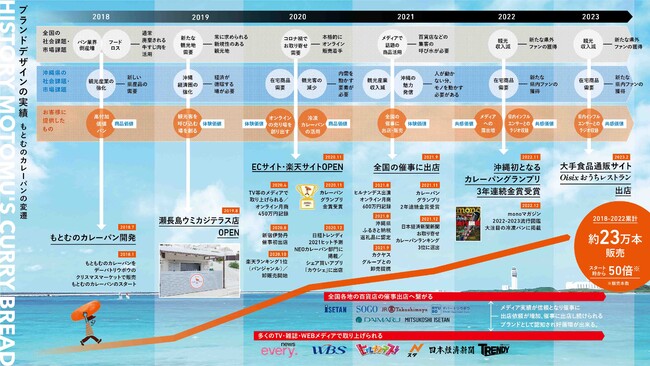 パン需要が増加していく中、主食というインフラを保持する重要性や、数あるパンの中でも絶対的なNo.1商品やメーカーが存在しない「カレーパン」というジャンルを発見したことで、一気にブランドポジションが鮮明となりました。ブランドデザインでは、まずは、女性やお子様でも食べやすい細長い形状を選択。そして、一度目にすると忘れない、ビビッドなオレンジをあしらったパッケージを自社で開発することでSNSでの話題化を実現。さらに、商品自体のストーリーとして、産地の付加価値を高めるために沖縄・瀬長島ウミカジテラスでの店舗出店を行うことで、沖縄の新たなソウルフードとして「もとむのカレーパン」のブランドの輪郭をはっきりさせました。