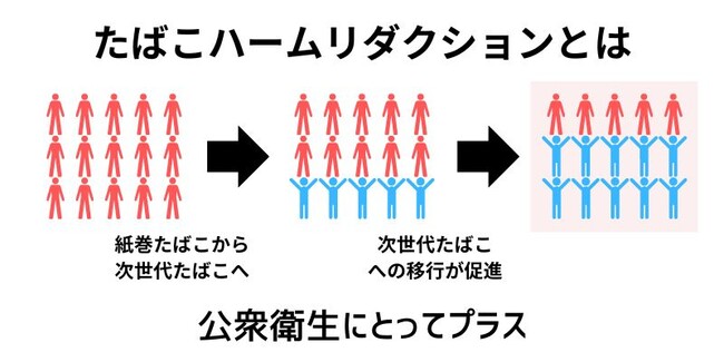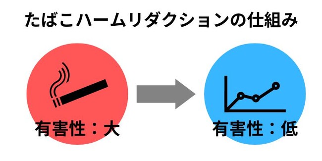 たばこハームリダクションの仕組みはシンプルで、有害性の高いものから低いものに変えていくことで、強いては社会全体のメリットに繋がる、というもの。