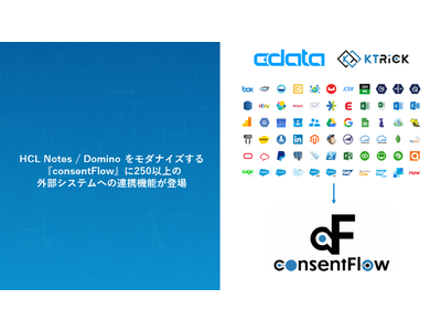 2023年4月4日、CData Software Japan 合同会社(本社:アメリカノースカロライナ州、日本オフィス:宮城県仙台市、代表社員 職務執行者:疋田 圭介、以下CData)とHCL Notes / Domino 向けのモダナイズソリューションを提供するケートリック株式会社(本社:東京都目黒区、代表取締役:田付 和慶、以下ケートリック)は業務提携し、ローコード開発・高機能ワークフローツールである『consentFlow』に250種類以上のSaaS / DB 連携機能を追加することを発表します。