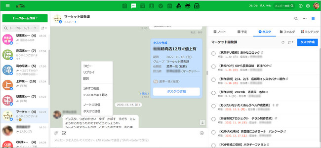 広告や店内POPの校正作業は、タスク機能の一覧へ集約。トークルームに投稿される膨大な校正指示を、任意のトークを右クリックしタスクとして簡易にリスト化できることで、進捗管理がしやすくなりました。