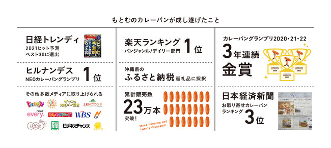 2020年に公式オンラインショップを開設し、多い日には1日に約6,000本を販売。各メディアにて入手が難しい「幻のカレーパン」としてご掲載をいただき、日本一のカレーパンを決める「カレーパングランプリ2022」では沖縄県勢初となる、3年連続金賞を獲得!楽天ランキング「パンジャンル/デイリー部門」でも1位を獲得し、さらに2021年12月に「日本経済新聞」の土曜版「NIKKEIプラス 1」のお取り寄せカレーパンランキングで「もとむのカレーパン」が3位を獲得しました。2022年4月から沖縄県内でラジオCM放送中!