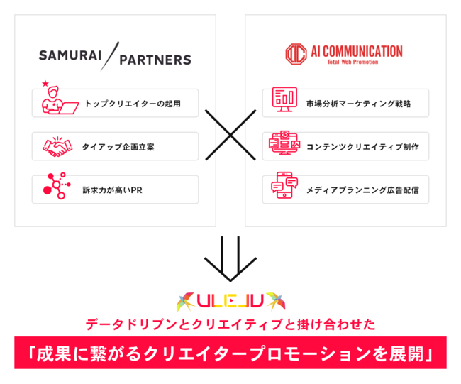 この度の業務提携により、「ULELU」のYouTuberマッチングサービスにおいてクライアントはサムライパートナーズが提携している100名超のトップクリエイターをプロモーションに起用することが可能となりました。単に有名なインフルエンサーを起用して情報を拡散するだけではなく、「ULELU」を展開するAIコミュニケーションが持つWEBマーケティング分野における知見と実効果にコミットする戦略設計により、データドリブンとクリエイティブを掛け合わせたクリエイタープロモーションを実現します。
