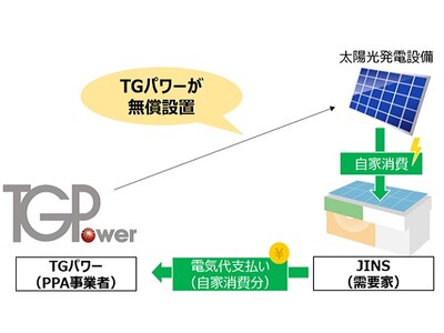 本事業はTGパワーと需要家であるJINSが法人向けPPAサービス「TGPでんき」を契約締結することで、店舗の太陽光発電設備にかかる初期投資費用および維持管理のメンテナンスのコストを負担することなく、追加性のある再生可能エネルギー電力の供給を受けることが出来ます。