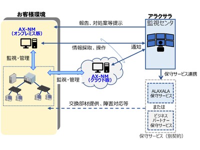 アラクサラはこうした課題の解決をご支援するため、新たにネットワークの遠隔監視と運用支援をオンプレ型またはクラウド型で提供するサービス「ALAXALA遠隔監視サービス」を開始しました。ALAXALA遠隔監視サービスは、数十年と受け継がれてきたネットワーク機器の設計開発、保守のノウハウを駆使して、アラクサラのネットワーク運用管理システムAX-Network Manager(AX-NM)*1を活用し、異常・故障等の原因となる対象をきめ細かに監視することで、お客様のネットワーク管理者の負担を減らしながら、問題発見、対処を迅速かつ簡単に実施することを支援します。