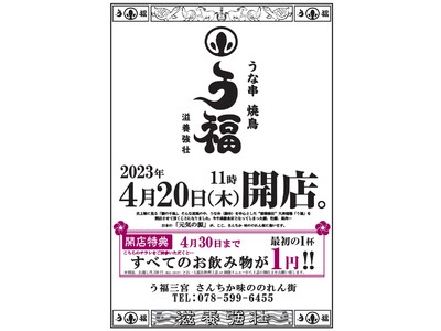 株式会社シーズン2(東京都渋谷区)は、2023年4月20日神戸三宮に【うなぎ 焼き鳥 う福 さんちか味ののれん街】(所在地 : 兵庫県神戸市)をオープン致します。