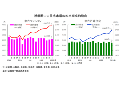 (公社)近畿圏不動産流通機構が4月18日に発表した2023年1~3月期の近畿圏の中古マンション成約件数は、4,235件(前年同期比マイナス4.5%)と2期連続で減少し、市場の売り出し(新規登録)件数は15,548件(前年同期比プラス13.5%)となりました。成約件数は近畿圏の対象12地域中9地域が前年比で減少し、減少エリアは前の期と同数で、取引が軟調なエリアが多くみられました。