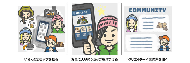 キャンプの前にはURIBAに出店している個性的なショップを覗いてお気に入りの商品を購入、商品が届いたら次のキャンプが待ち遠しくなるようなマーケットプレイスを目指していきます。
