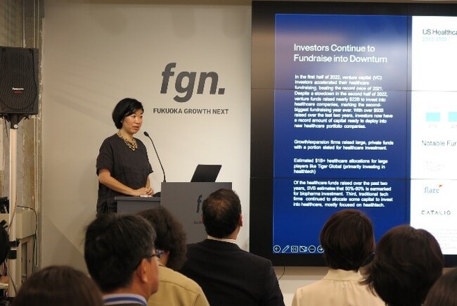 本イベントでは、アメリカの第一線で活躍するVC「Medtech Venture Partners」より、パートナーChiristine Winoto氏、「Kicker Ventures」より、マネージングパートナー 清峰 正志氏をお招きし、お二人によるキーノートスピーチ、Q&Aセッション、福岡を拠点とするメディカル・ヘルスケア関連のスタートアップ・研究者によるピッチやネットワーキングを実施し、海外志向のスタートアップや研究者、スタートアップ支援者が参加しました。