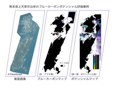 2050年カーボンニュートラルの達成に向けて、地方自治体におけるブルーカーボンの活用検討が進められています。海岸線を有する多くの自治体においては、今後ブルーカーボンの生成やクレジット化が見込まれる一方で、広大な海岸において、現状どこにブルーカーボンが藻場や海草として蓄積されており、また、どこで新たな生育活動ができる可能性があるのか、全体像の確認は容易ではありませんでした。ダイバー等を活用した現地調査は一部のエリアでは行われてきたものの、沿岸域全体に広げることは時間やコストの観点で現実的ではなく、結果として自治体の計画策定に活用可能な情報が不足していました。今回、ウミトロンは内閣府の支援を受け、ENEOSホールディングス株式会社及び熊本県上天草市と共同で、広域を安価に計測できる衛星リモートセンシングのデータを活用したブルーカーボンのポテンシャル評価サービスを開発しました。