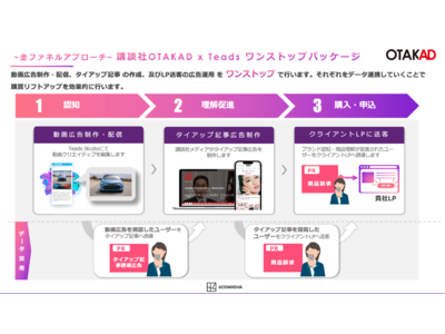 2023年4月20日、株式会社講談社(本社・東京都文京区、代表取締役社長:野間省伸)とTeads Japan株式会社(本社・東京都港区、マネージング・ディレクター:今村 幸彦)は、講談社のデータソリューションOTAKAD(以下OTAKAD)および同社の有する媒体とTeadsのプラットフォームを連携し、ユーザーの購入ファネル(商品購買過程)において能動的なアテンションを促す広告商品を開発いたしました。 インタラクティブな広告フォーマットを活用しながら、デジタル戦略上に欠かせない認知獲得を経て、講談社のタイアップ広告との連動でユーザーの理解促進と購入までを実現するワンストップパッケージをリリースいたします。 本ソリューションでは適切なタイミングで適切な情報を消費者の元に届けることができる、進化型のタイアップ広告としてブランドの適合性や、コンテキストターゲティングにおけるセグメントの強化施策の導入を可能にしています。動画広告制作・配信、タイアップ記事 の作成、及びLP送客の広告運用をデータの連携によりワンストップで行うことで、購買リフトアップを効果的に行います。< OTAKAD x Teadsワンストップパッケージ概要>・認知獲得動画広告配信施策と、タイアップ記事広告制作の連携を強化、LP送客のための広告配信をワンストップで提供。・動画広告を見たユーザーにタイアップ記事閲読を促すことで1ユーザーに対して連続した施策を行うことができるようになり、ユーザーに更なる訴求商品理解を無駄なく促すことが可能に。・複合的な施策手法をワンストップで行うことにより単一手法ではカバーしきれなかったユーザーにもアプローチができ、ユーザーと適切なタイミングで接点を作る。