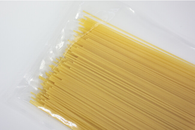 パスタキットで使われているパスタはハーフサイズで約135mmです。良く見るとパスタの長さがまちまちになっています。これはロングパスタを人力で折っているためです。発売当初の10年前はハーフサイズのパスタは中々流通しておらず、アウトドアでの茹で易さを追求した結果ハーフサイズがベストと考え、シーズコア 加工場(通称:ラボ)で人の手で折っていました。現在はハーフサイズのパスタも入手可能ですが、この長さがまちまちなことがシーズコア商品のらしさの象徴でもあり、愛嬌でもあるので引き続きこの(愛称)手折りパスタを使用しています。