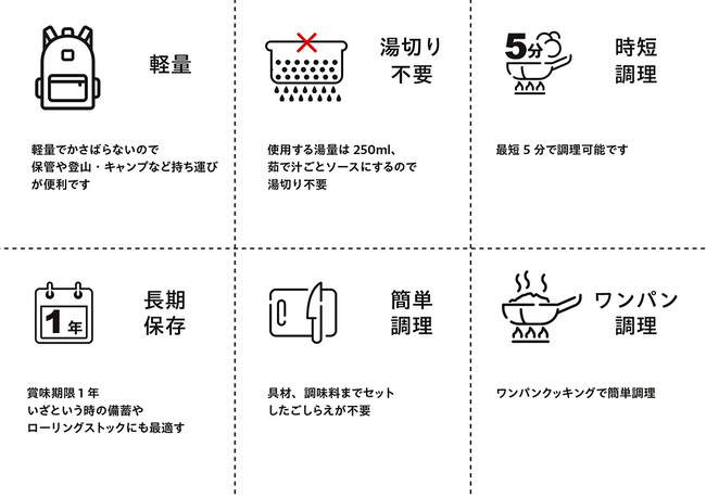 ●オールインワン(ワンパン料理・ワンパッケージ)パスタキットはパスタ・具材・調味料が全てセットされたワンパッケージです。かさばらず保管や持ち運びに便利です。下ごしらえ不要で小さめのフライパンで一つで調理が可能なので、洗い物も少なく、食卓から山頂まで、さまざまなシーンでパスタをお楽しみいただけます。
