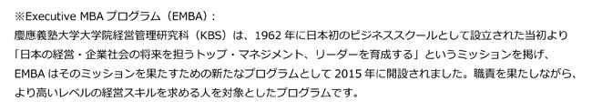 https://www.kbs.keio.ac.jp/graduate/emba/index.html会社概要・社名: 株式会社ギルドヒーローズ・所在地: 東京都千代田区神田鍛冶町3-4 oak神田鍛冶町7F・代表者: 代表取締役 森井 聡・コーポレートサイト: