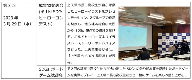 高校生のアイデアによるSDGsヒーローが熊本県に出現株式会社ギルドヒーローズ(所在地:東京都千代田区、代表取締役:森井聡)は、熊本県上天草市のSDGs普及事業の一環として、2023年1月~3月にかけて「SDGs特別講座」を上天草高等学校にて開催し、2人のSDGsヒーローが生まれました。