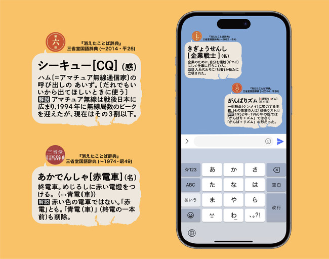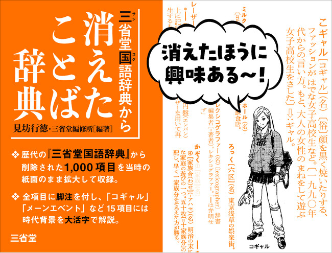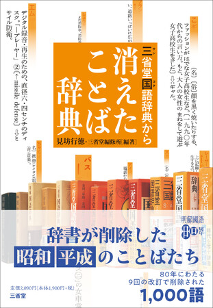 前身となる1943(昭和18)年発刊の『明解国語辞典』以降、2022(令和4)年刊『三省堂国語辞典 第八版』まで、約80年にわたる計9回の改訂で削除された1,000項目を厳選し、当時の紙面をそのまま拡大して五十音順に配列しています。時代の移り変わりによって使われなくなった言葉、かつては大切にされていた言葉を発掘し、同時代を生きた言葉たちを愛おしむ内容となっています。各項目に脚注を付し、削除した版数・年次を明示しています。「オート三輪(車)」「キーパンチャー」「コギャル」「バスガアル」「メーンエベント」など15項目は活字を大きくし、時代背景や関連語の盛衰を特記致しました。若者からシニアまで、驚きとなつかしさに満ちた昭和レトロ/平成レトロのよすがとなる辞典です。