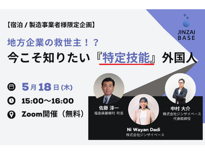株式会社ジンザイベース(本社:東京都千代田区、代表取締役:中村大介)は、福島県耶麻郡磐梯町(町長:佐藤淳一)と合同で『地方企業の救世主!?今こそ知りたい『特定技能』外国人』と題して、深刻な人手不足に悩む宿泊/製造業事業者様向けのオンラインセミナーを5月18日(木)に開催いたします。