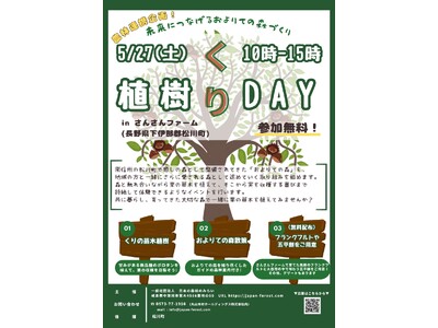 持続可能な森林環境を確立し、人と森林の豊かな未来を目指す一般社団法人 日本の森林のみらい(代表理事:丸山大知、所在地:岐阜県中津川市苗木)は、2023年5月27日(土)に長野県下伊那郡松川町のおよりての森で、植樹イベント「植樹くりDAY」を開催します。イベントでは栗200本の植樹のほか、森林アドバイザーの案内による森林散策、杉の伐倒見学を実施します。