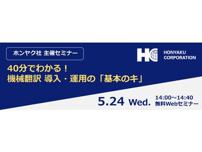 産業分野に特化した翻訳・機械翻訳サービスを展開する株式会社ホンヤク社(代表取締役:原田真)は、『40分でわかる!機械翻訳 導入・運用の「基本のキ」』と題した無料Webセミナーを2023年5月24日(水)に開催します。