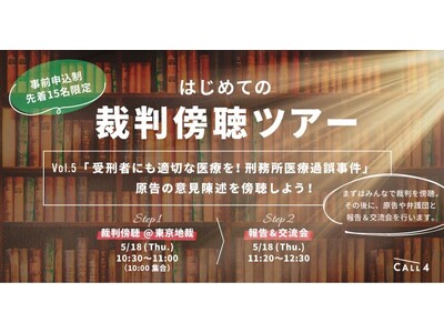 日本初(※1)の公共訴訟支援に特化したウェブプラットフォームCALL4(コールフォー)(運営:認定特定非営利活動法人CALL4、代表理事:谷口太規)は、2023年5月18日に東京地方裁判所で行われる「受刑者にも適切な医療を!刑務所医療過誤事件」の東京地裁での第一回期日を、CALL4メンバーと傍聴する法廷傍聴ツアーの参加募集を5月11日より開始いたします。