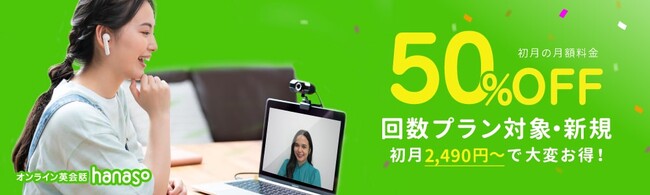 株式会社アンフープ(所在地:静岡県富士市、代表取締役社長:重森 渉)がサイト運営する、無料通話ソフトZoomまたはSkypeを利用したオンライン英会話スクール「hanaso」では、2023年5月16日(火) ~6月14日(水)に、新規入会者を対象として回数プラン初月月額料金(4,980円~7,980円)(税込)が半額になる「新緑キャンペーン2023」を実施いたします。