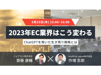 AnyMind Group株式会社(読み:エニーマインドグループ、代表取締役CEO:十河 宏輔)は、ソーシャルコマースサービス「シェアモル」を運営するシェアモル株式会社と共催で、2023年5月25日(木)15:00よりEC事業者向け無料オンラインセミナー 「2023年EC業界はこう変わるーChatGPTを用いた生き残り戦略とはー」を開催いたします。
