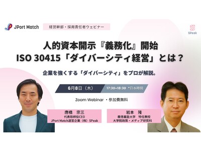 国籍のダイバーシティ&インクルージョンを目指す、株式会社SPeakは、人的資本開示義務化の開始で上場企業4000社を対象となり注目を浴びる「ISO 30415『ダイバーシティ経営』とは?~企業を強くする本当の「ダイバーシティ」をプロが解説~」を、2023年6月8日(木)17時30分から50社限定でオンライン開催いたします。ゲストには、人的資本調査2022 審査員・HRテクノロジー大賞審査委員長を務める慶應義塾大学大学院・岩本隆氏をお招きし、上場企業にとっての「ダイバーシティ経営」をどのように取り込んでいくべきかを解説する、実践型ビジネスウェビナーです。