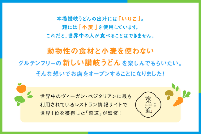 小麦アレルギーやヴィーガンの方でも、皆で一緒に食事を楽しめる『プラントベース・グルテンフリーの讃岐うどん店』を軸にした「NO BORDER UDON」プロジェクトを始めます。