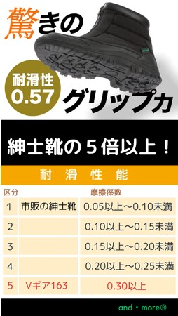 ・紳士靴の5倍の耐滑性!コックシューズにも使用される耐滑アウトソールで悪天候でも歩くと「笑顔」に!