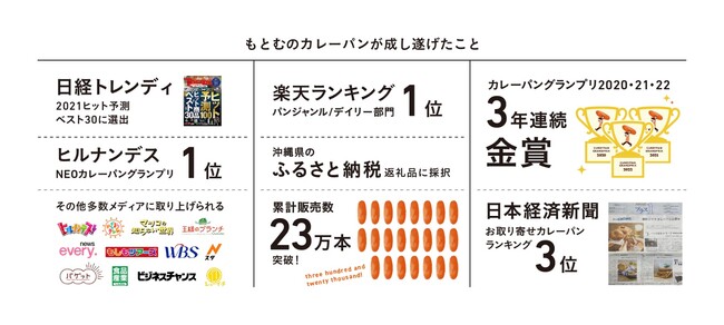 2020年に公式オンラインショップを開設し、多い日には1日に約6,000本を販売。各メディアにて入手が難しい「幻のカレーパン」としてご掲載をいただき、日本一のカレーパンを決める「カレーパングランプリ2022」では沖縄県勢初となる、3年連続金賞を獲得!楽天ランキング「パンジャンル/デイリー部門」でも1位を獲得し、さらに2021年12月に「日本経済新聞」の土曜版「NIKKEIプラス 1」のお取り寄せカレーパンランキングで「もとむのカレーパン」が3位を獲得しました。2022年4月から沖縄県内でラジオCM放送中!