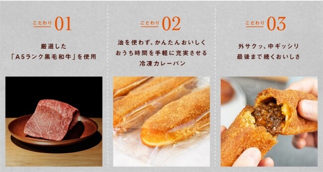 もとむのカレーパンは、“黒毛和牛の美味しさを追い求め”、“たくさんの人に求められる”ようなカレーパンを届けたいという想いを込めて誕生しました。東京の食文化の台所とも言われる築地の焼肉店「築地焼肉もとむ」の人気メニューの牛すじカレーをベースに、厳選した「A5ランク黒毛和牛」を、さくっと軽い食感のパンの中に贅沢に詰め込んだこだわりの逸品です。全長18cmのパンの中にA5ランクの黒毛和牛を贅沢に使用しています。独自の冷凍技術と揚げ&焼き製法でヘルシーに仕上げたさくっと軽い食感のカレーパンです。