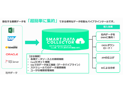 KUIXが開発した「SMART DATA COLLECTOR for DB」(スマコレ for DB)という便利なデータ収集&パイプラインツールをご紹介します。このツールは、散在する業務データを「超簡単に集約」できる機能を持っています。社内データをDWHに集約したい場合、スマコレであれば標準コネクタで様々なデータソースと接続しDWHに集約することができます。