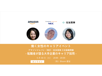 株式会社Bloom(本社所在地:東京都渋谷区、代表取締役:平原 俊幸)は、「働く女性のキャリアイベント アマゾンジャパン・NEC・住友商事 3社協働開催 -転職者が語る大手企業のキャリア採用-」を2023年5月30日(火)に開催します。