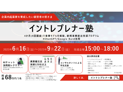 開講以来129社・450名を超える卒業生を輩出してきた「イントレプレナー塾」が、AIチャット(「ChatGPT」「Google Bard」)と新規事業立案を掛け合わせた新カリキュラムを実装しリニューアルオープン。