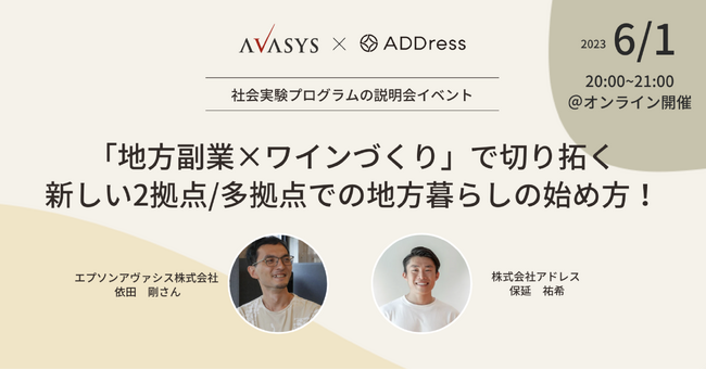 月額9,800円から始められる定額制多拠点居住プラットフォーム「ADDress」を運営する株式会社アドレス(本社:東京都千代田区、代表取締役社長:佐別当隆志、以下「ADDress」)は、長野県に本社を置くソフトウェア開発企業のエプソンアヴァシス株式会社(代表取締役:武井喬、以下「エプソンアヴァシス」)が主催する長野県塩尻市を主な実施地とする社会実験プログラム「『副業 × ワインづくり』で地方暮らしの未来を拓く」に、住まいと暮らしの提供サービスとして参画します。地域企業が抱える課題をITで解決する人材および、長野の地域産業である「ワインづくり」に取り組む副業人材を6月1日より募集します。エントリーの際はADDress会員登録が必要です。