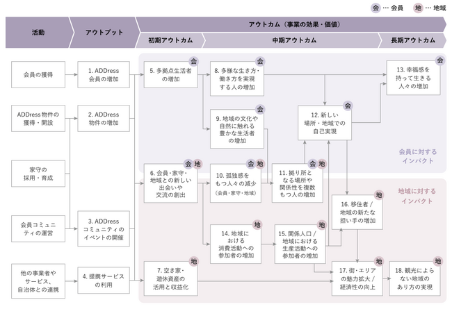ADDressが目指すべき社会課題におけるKPI(重要業績評価指標)を設定するために、「ロジックモデル」(=下図)を作成し、アウトプットと初期・中期・長期アウトカムの計18項目のデータ収集を開始しました。ADDress会員(利用者)に対する社会的インパクトとして「幸福感を持って生きる人々の増加」を目指すために、「多様な生き方・働き方を実現する人の増加」「新しい場所・地域での自己実現」が重要指標であり、地域側にとっては「関係人口/地域の生産活動への参加者の増加」が地域に対する社会的インパクトに向けた重要指標と位置付けています。