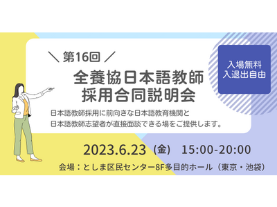 日本語教育・日本語教師の質的向上を目指す一般社団法人全国日本語教師養成協議会(以下、全養協)では、6月23日(金)に東京・池袋にて「第16回日本語教師採用合同説明会」を開催いたします。