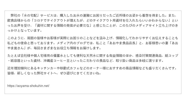 この度、株式会社あおやま食品(東京都世田谷区駒沢5丁目14ー7 阿部信ビル)は、自社サイトの一環として、自社商品や自社商品に関連したお役立ち情報を掲載するオウンドメディアサイトを立ち上げましたのでご報告いたします。