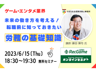 登壇者(講師)にはゲーム業界から社会保険労務士に転身をされたご経歴をお持ちの鎌田愼司氏を招き、「各種給付」「退職交渉」「年金・健康保険・任意継続」「固定残業の考え方」「フリーランスから社員へ」などを分かりやすく解説いたします。