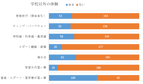 直近1年の学校以外の体験機会について、習い事(音楽・スポーツ・習字等)は約半数がしており、こどもに機会を提供している家庭も一定いることがわかりました。ただし、それ以外の項目では4分の1のみが機会があったと回答。特に費用の掛かるスポーツ観戦等は少ない傾向にありました。